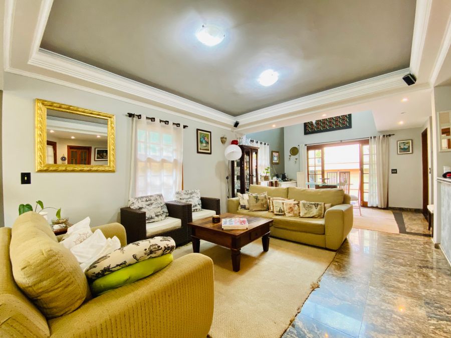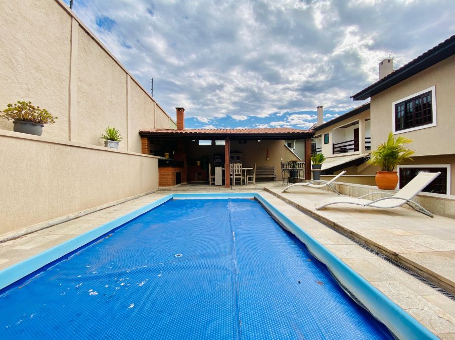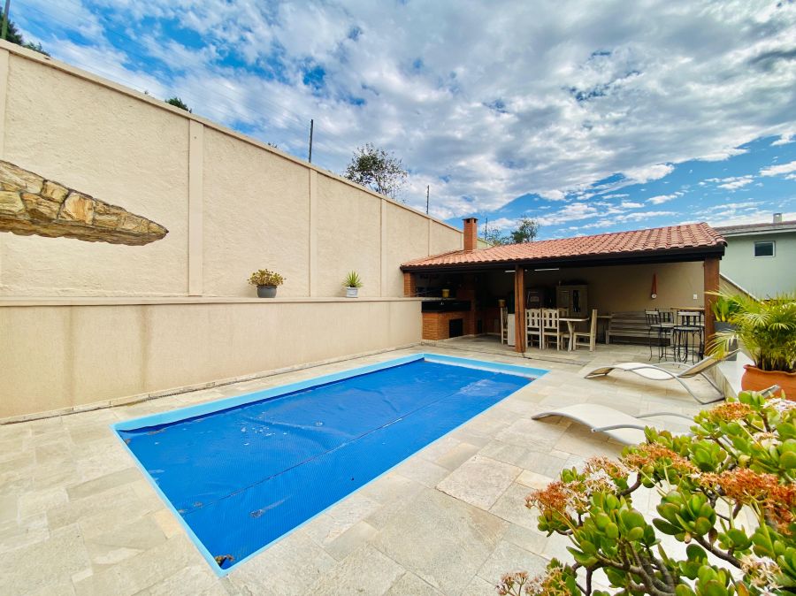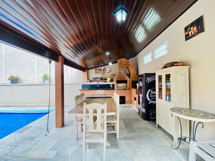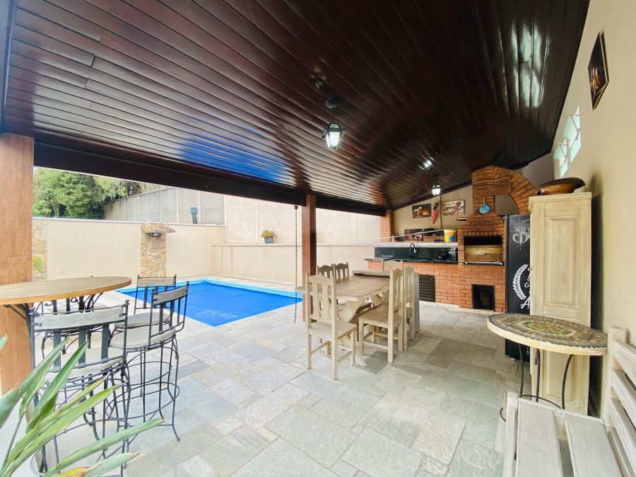 Na área externa, o lazer é garantido: espaço gourmet com churrasqueira e fogão a lenha, perfeito para reunir amigos e família, além de uma bela piscina com cascata que traz ainda mais charme ao ambiente.